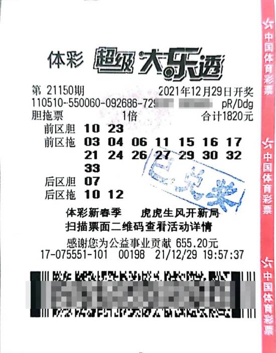 在体彩超级大乐透第21150期开奖中,四川达州一位中奖者通过一张前区2胆15拖+后区1胆2拖的胆拖票,中出1注1000万元一等奖及小奖一连串,单票收获奖金1026万元。该中奖者说,他前一晚开奖后就知道中了大奖,按捺不住激动的心情决定连夜赶到成都领奖。晚上11点多出发,凌晨4点多到达成都,在酒店休息了一会儿就到体彩中心领奖了。