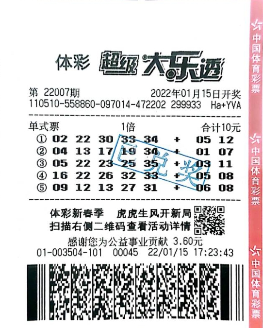 1月15日体彩大乐透第22007期开出前区号码05、22、23、25、35,后区号码03、11。本期中出3注基本投注一等奖,每注奖金1000万元,四川成都一位幸运购彩者命中一等奖1注。1月17日,中奖者来到四川省体彩中心兑奖大厅办理了兑奖事宜。