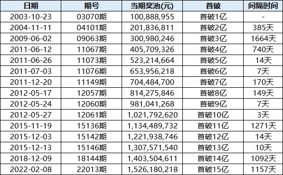 双色球奖池首破15亿创历史北京时间2月8日,福彩双色球迎来春节休市后的首期开奖(22013期),当期开奖结束后,双色球奖池来到15.26亿多元,历史上首次突破15亿元大关,而之后第22014期开奖,这一纪录再次被刷新,目前奖池余额为15.44亿多元,大有继续上涨之势!