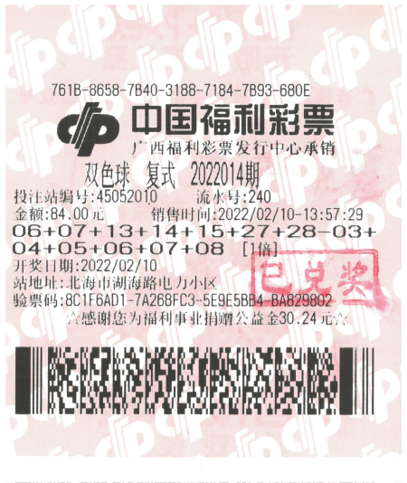 2022年2月10日双色球2022014期,广西中出了1注一等奖,总奖金高达779万元,其投注方式为84元的复式7+6投注,落户于北海市的45052010投注站。这注一等奖也是新春开市后的第1个一等奖。