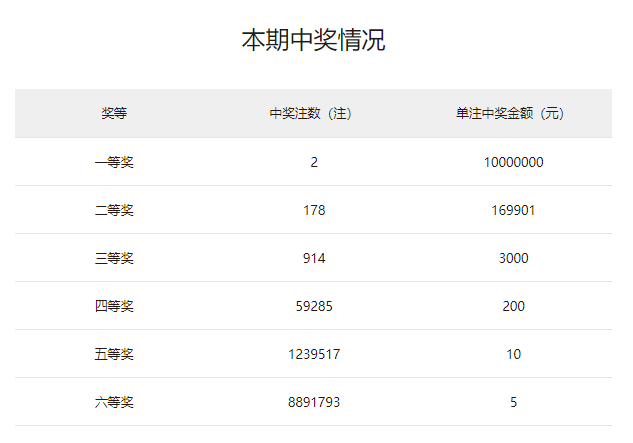 22:10 本期一等奖开出2注,单注奖金1000万元分落天津、湖南。二等奖开出178注,单注奖金16.9万元。本期双色球销量为3.92亿元,计奖结束后奖池余额16.12亿元。