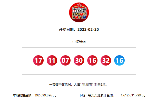 福彩开奖北京时间2022年2月20日,福彩双色球迎来第22018期开奖,当期奖号为:红球07 11 16 17 30 32,蓝球16。本期头奖仅开出2注1000万,分落天津、湖南。值得注意的是,本期开奖结束后,双色球奖池达到16.12亿多元,历史首次突破16亿大关!