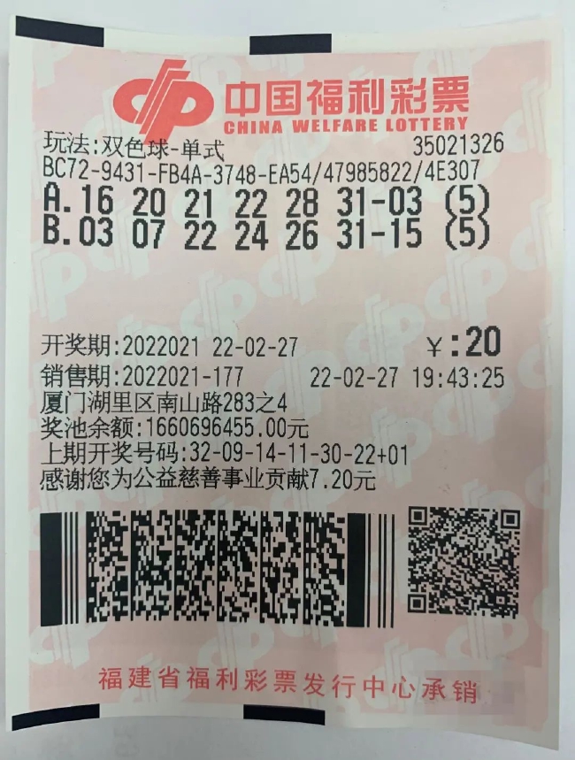 2月27日晚,双色球第2022021期开奖,福建收获6注单注奖金为446173元的二等奖,厦门斩获其中5注,全部花落湖里区南山路283之4的福彩35021326投注站,中奖彩票是一张5倍投注的单式票,奖金总额223万元。