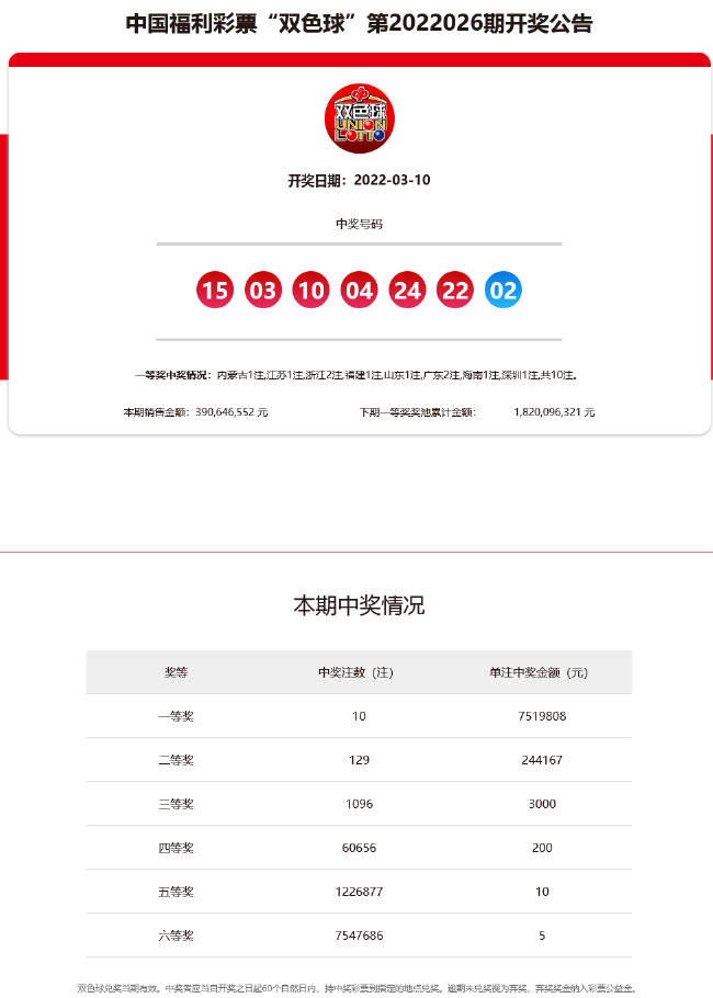 北京时间2022年3月10日,福彩双色球迎来第22026期开奖,当期奖号为:红球03 04 10 15 22 24,蓝球02。