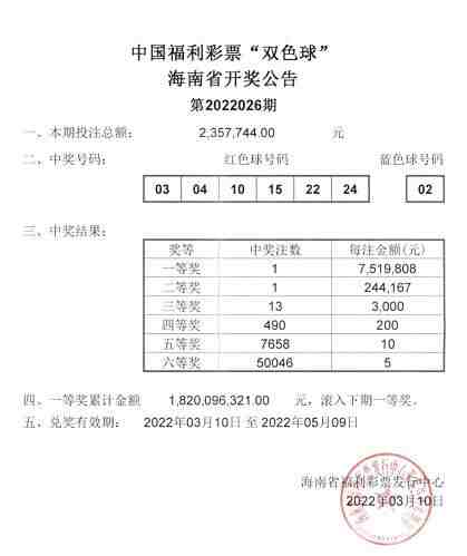 3 月 10 日晚,双色球 22026 期开奖 号码公布,中奖号码为红球:03、04、 10、15、22、24,蓝球:02。全国共中 出一等奖10注,其中海南1注、内蒙古1 注、江苏1注、浙江2注、福建1注、山 东1注、广东2注、深圳1注,单注奖金 751万元。
