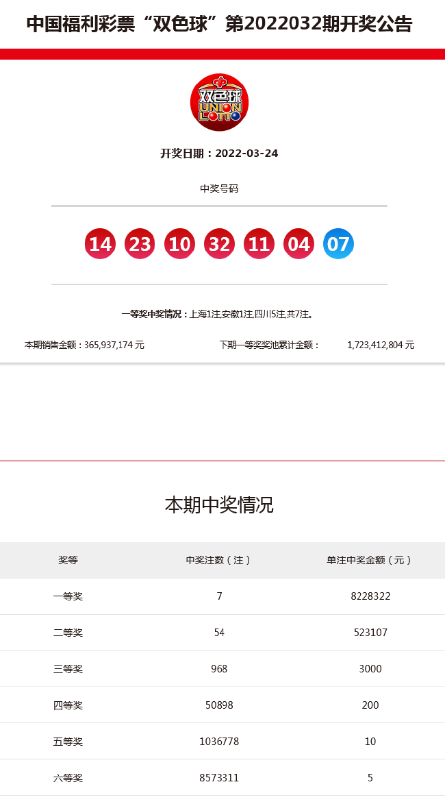 22:10 本期一等奖开出7注,单注奖金822万分落3地。其中5注头奖花落四川,若为一人所中,即可揽获4114万元大奖!另外2注头奖分落上海、安徽。二等奖开出54注,单注奖金53.31万元。本期双色球全国销量为3.65亿元,计奖结束后奖池余额为17.23亿元。