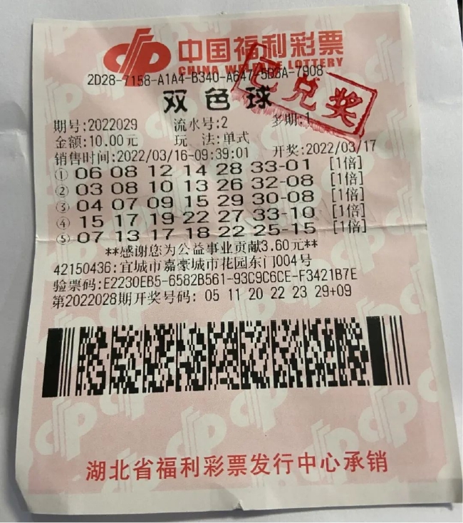 3月17日晚,福彩双色球第2022029期开奖,全国当期共开出10注一等奖,单注奖金631万元。我省收获了其中两注,分别被襄阳、宜昌两地购彩者分享。