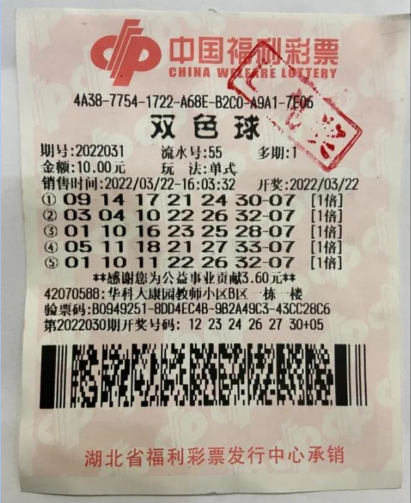3月22日晚,双色球第2022031期开奖。武汉市洪山区华科大康园教师小区一栋一楼的42070588号投注站中得1注一等奖,奖金550万元。