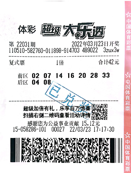 3月23日,体彩大乐透第22031期开奖。前区开出号码07、14、16、20、28;后区开出号码04、08。本期全国中出3注一等奖,其中2注是单注奖金1800万元的追加投注一等奖,全部落户北京;1注是单注1000万元的基本投注一等奖,花落四川宜宾。