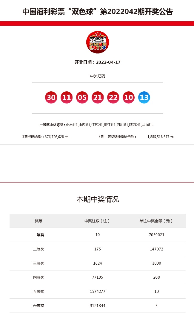 北京时间2022年4月17日,福彩双色球第22042期开奖,以下是详细开奖流程: