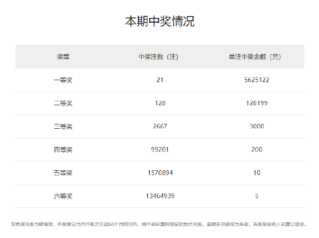 22:10 本期一等奖井喷21注,单注奖金562万余元;21注头奖分落全国11地,其中贵州中出5注最多,福建揽得4注,浙江、山东、四川各开出2注,上海、江西、重庆、湖北、湖南、深圳各1注。二等奖开出128注,单注奖金12.8万余元。本期双色球全国销量为3.60亿元,计奖结束后奖池余额为18.33亿元。