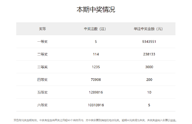22:10 本期一等奖开出5注,单注奖金934万,5注头奖分别落于河北、辽宁、贵州、云南和深圳。二等奖开出114注,单注奖金23.8万。本期双色球销量为3.89亿元,计奖结束后奖池余额19.51亿元。