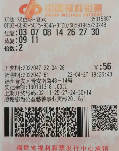4月28日晚开奖的福彩双色球第2022047期,福建购彩者好运爆发,揽获4注单注奖金为562万元的超值一等奖。其中2注花落福州市晋安区晋安南路48-14号的福彩35015307投注站,中奖彩票是一张2倍投注的7+2复式票,不仅中得2注一等奖,还中得2注二等奖、12注三等奖和12注四等奖,奖金共计1154万元!
