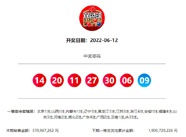 22:10 本期一等奖井喷33注分落15地,单注奖金515万余元,4注头奖分落浙江、福建和广东;3注头奖分落辽宁、江苏和山东;2注头奖分落河南、湖北和广西;北京、陕西、内蒙、黑龙江、安徽和云南各中得1注。二等奖开出281注,单注奖金2.2万余元。本期双色球销量为3.70亿元,计奖结束后奖池余额19余亿元。