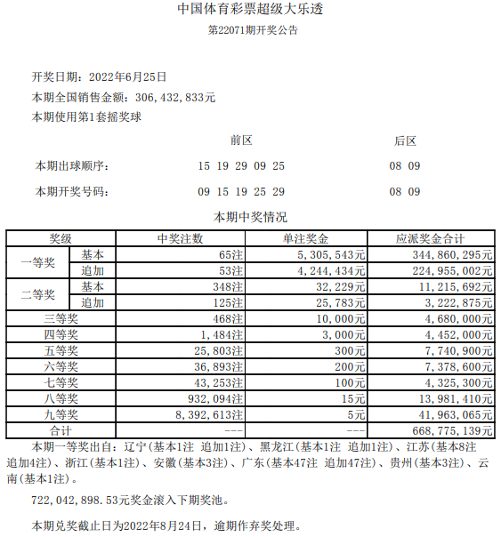 开奖号码北京时间6月25日晚,体彩大乐透第22071期开奖。当期开奖号码为:前区09 15 19 25 29,后区08 09。本期一等奖开出65注,单注奖金530万元,其中53注选择追加,多得424万元奖金,单注追加奖金达954万!据检索,广东中出的47注追加头奖均出自肇庆08008028101站点,其中有一张彩票独擒4.39亿元巨奖,肯定为一人独中,中奖彩票是一张46倍投注的单式追加倍投票,单票投入金额为138元;另一张彩票中出954万元大奖,中奖彩票是一张单式5注追加票,投入金额为15元。