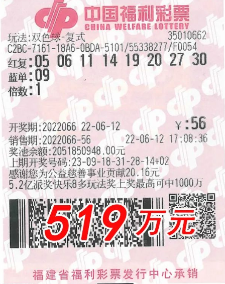 6月12日晚开奖的福彩双色球第2022066期,全国井喷33注单注奖金达515万元的超值一等奖。福建大获丰收,狂揽4注,其中1注花落福州市长乐鹤上镇沙京村京林367号的福彩35010662投注站,中奖彩票是一张8+1的复式票,总奖金达519万元!
