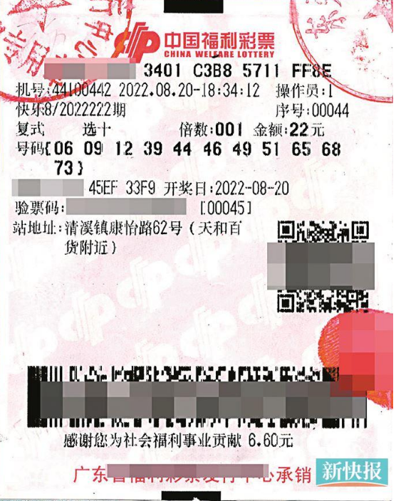 8月20日,福彩快乐8游戏第22222期开奖,当晚全国共开出4注“选十中十”,单注奖金500万元,其中广东中出2注“选十中十”。经检索,广东中得的其中一注“选十中十”出自东莞市清溪镇康怡路62号(天和百货附近)的44100442福彩销售网点,大奖彩票是一张22元“11码选十”复式自选票,共中得1注“选十中十”和10注“选十中九”,中奖总金额508万元。