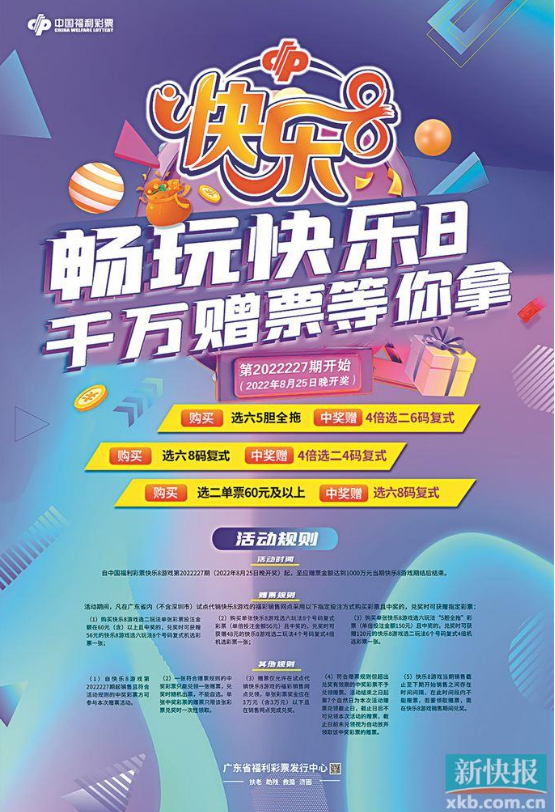 广东福彩“畅玩快乐8,千万赠票等你拿”促销活动火热进行中,自中国福利彩票快乐8游戏第2022227期起,至应赠金额达到1000万元当期快乐8游戏期结后结束,凡在广东省内(不含深圳市)试点代销快乐8游戏的福彩销售网点采用指定投注方式购买且中奖的,兑奖时可获赠指定彩票,详情如下:购买选二玩法单张彩票投注金额在60元(含)以上且中奖的,兑奖时可获赠56元的选六玩法8个号码复式机选彩票一张;购买单张选六玩法8个号码复式彩票(单倍投注金额56元)且中奖的,兑奖时可获赠48元的选二玩法4个号码复式4倍机选彩票一张;购买单张选六玩法“5胆全拖”彩票(单倍投注金额150元)且中奖的,兑奖时可获赠120元的选二玩法6个号码复式4倍机选彩票一张。