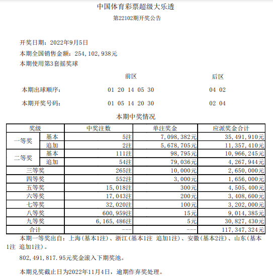 体彩开奖北京时间9月5日晚,体彩大乐透第22102期开奖。当期开奖号码为:前区01 05 14 20 30,后区02 04。