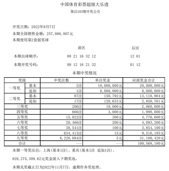 大乐透开奖截图北京时间9月7日晚,体彩大乐透第22103期开奖。当期开奖号码为前区08 12 16 21 32,后区01 12。本期通过2.57亿元销量,为国家筹集彩票公益金9282万元,计奖结束后奖池余额8.28亿元。