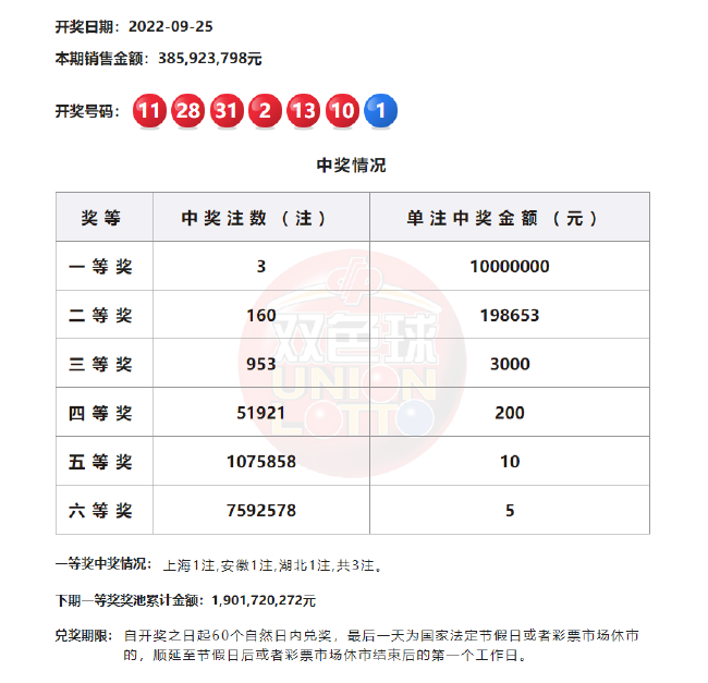 22:10 本期一等奖开出3注,单注奖金1000万元,3注头奖分落上海、安徽、湖北。二等奖开出160注,单注奖金19.8万余元。本期双色球销量为3.85亿元,计奖结束后奖池余额19.01亿元。
