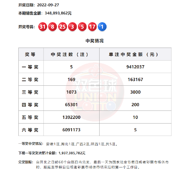 22:20 本期一等奖开出5注,单注奖金941万余元,其中广西中得2注,剩余3注分落安徽、湖北、陕西。二等奖开出169注,单注奖金16万余元。本期双色球销量为3.48亿元,计奖结束后奖池余额19.37亿元。