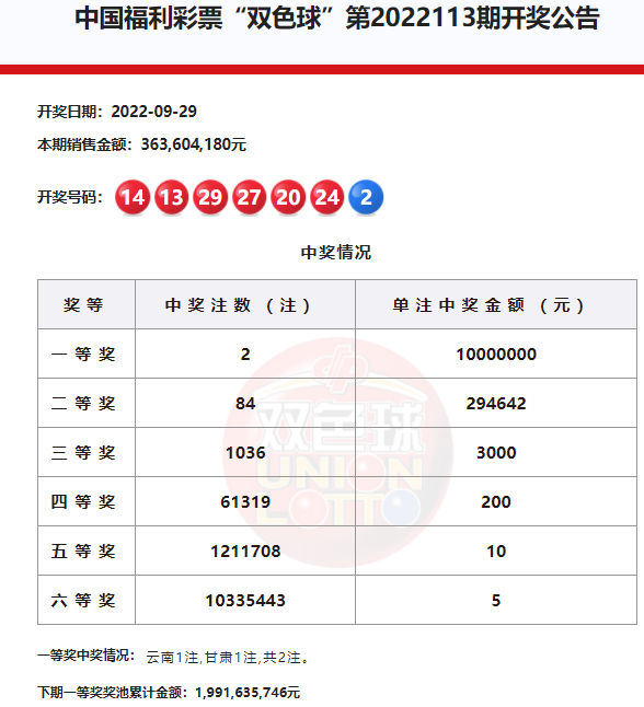 22:20 本期一等奖开出2注,单注奖金1000万元分落云南、甘肃。二等奖开出84注,单注奖金29.4万余元。本期双色球销量为3.63亿元,计奖结束后奖池余额19.91亿元。