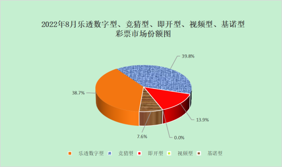 8月份,乐透数字型彩票销售133.27亿元,同比增加5.17亿元,增长4.0%;竞猜型彩票销售137.39亿元,同比减少2.36亿元,下降1.7%;即开型彩票销售48.03亿元,同比增加11.29亿元,增长30.7%;基诺型彩票销售26.07亿元,同比增加4.57亿元,增长21.3%。8月份,乐透数字型、竞猜型、即开型、基诺型彩票销售量分别占彩票销售总量的38.7%、39.8%、13.9%、7.6%。视频型彩票销售0.0002亿元,同比增加0.0001亿元。