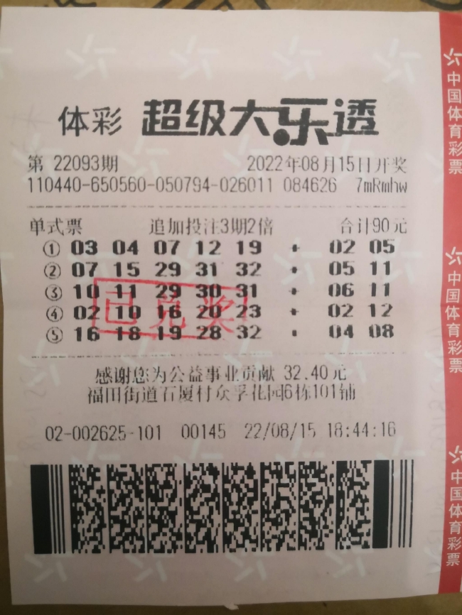福小姐于8月15日在深圳体彩4402002625实体店(地址:福田区石厦村众孚花园6栋101铺)购买了一张2倍、3期投注的5注追加大乐透单式票,其中第一注号码命中22094期一等奖,奖金合计2432万余元,并贡献个人偶然所得税486万余元。