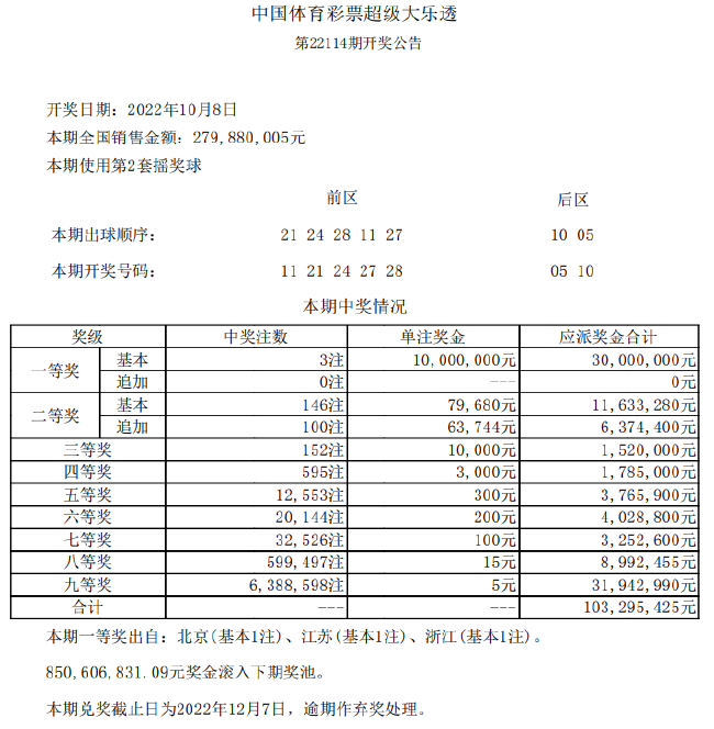 本期全国共开出3注1000万元基本投注一等奖,分落北京、江苏、浙江,均没有追加。
