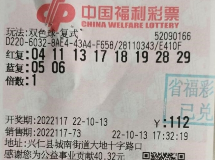 彩市航母双色球,大奖大、小奖多,彩市驰骋19年,创造无数奇迹与梦想,为数亿人送去爱心与幸运。这不,正值伏去秋来之际,双色球给黔西南彩民也送来秋日大礼。10月13日,双色球2022117期开奖,黔西南彩民凭借一张112元8+2复式票将大小奖“一网捞”,共计获得双色球奖金621万元,中奖彩票售出于黔西南兴仁县城南街道第52090166号投注站。