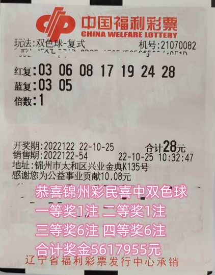 10月25日晚,中国福利彩票双色球游戏第2022122期开奖,号码为06、08、17、19、24、28,蓝球号码为05。当期双色球头奖井喷26注,单注奖金为551万多元。锦州福彩第21070082号销售网点中出辽宁唯一一注一等奖。中奖彩票采用7+2复试投注,中出一等奖1注、二等奖1注、三等奖6注和四等奖6注,奖金总额5,617,955元。