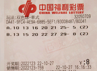 10月27日晚,双色球游戏第2022123期开出红球号码10、13、16、20、21、25,蓝球号码05。当期产生双色球头奖8注,单注奖金为755万多元。这8注一等奖花落天津、内蒙古、江苏等地。其中,我省喜中的2注一等奖出自苏州太仓。幸运彩民自选了2注号码,并分别进行了2倍投注,花费了8元,其中的第1注号码与当期的中奖号码完全一致,收获奖金1511万多元。