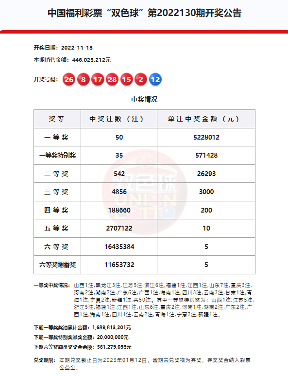 另外,本期一等奖特别奖2000万元全部派完,按照派奖规则,下期(第22131期)一等奖特别奖派奖金额为2000万元,六等奖翻番奖奖金余额561,279,095元。本期双色球销量为4.46亿元,计奖结束后奖池余额16.89亿元。