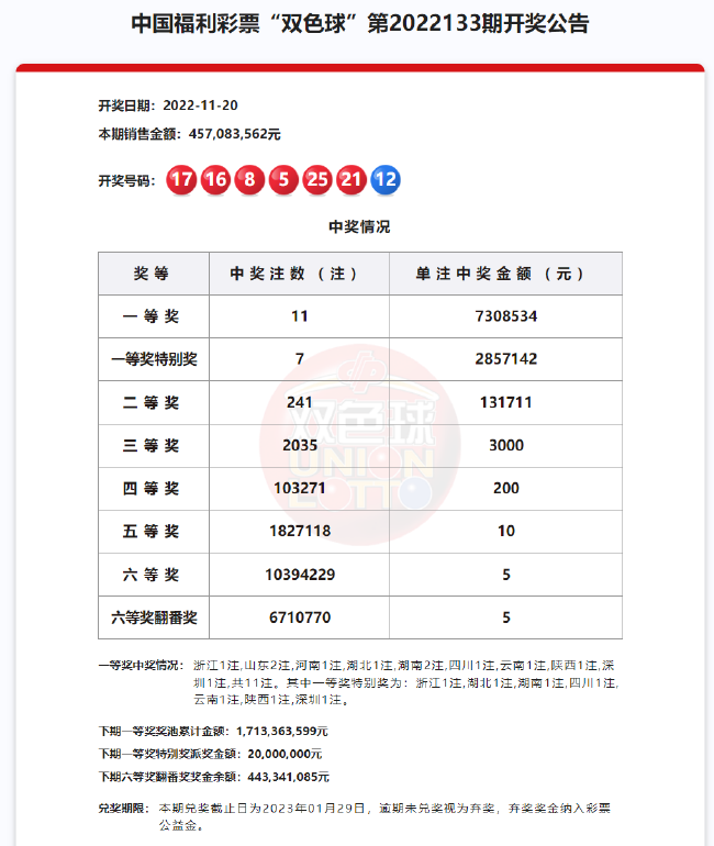 北京时间11月20日,福彩双色球第22133期开奖,同时本期也是双色球12亿大派奖活动的第9期。本期奖号:红球05 08 16 17 21 25;蓝球12。本期一等奖开出11注730.8万元,其中7注获得一等奖特别奖加奖285.7万元,单注奖金达到1016万余元。11注一等奖落于山东(2注)、湖南(2注)、浙江、河南、湖北、四川、云南、陕西、深圳,7注一等奖特别奖分落7地,浙江、湖北、湖南、四川、云南、陕西、深圳各1注。二等奖开出241注13.1万余元。