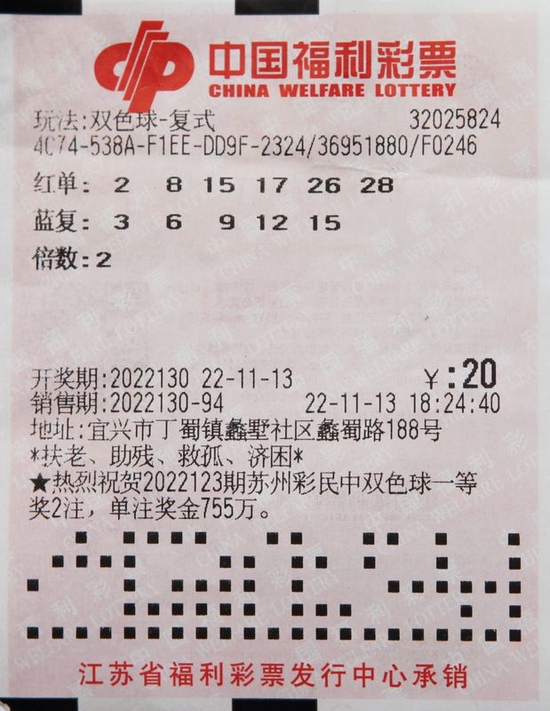 无锡2注大奖出自宜兴市丁蜀镇蠡墅社区蠡蜀路188号32025824站点,中奖者为同一人,这是一张自选20元的蓝球5码复式双倍投注彩票,销售日期为11月13日18时24分40秒。该票喜中2注一等奖、2注一等奖特别奖及8注二等奖,总奖金共计1180多万元。
