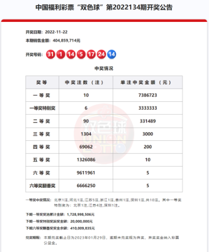 北京时间11月22日,福彩双色球第22134期开奖,同时本期也是双色球12亿大派奖活动的第10期。本期奖号:红球01 05 14 17 24 31;蓝球14。本期一等奖开出10注738.6万元,其中6注获得一等奖特别奖加奖333.3万元,单注奖金达到1072万余元。10注一等奖落于江苏(5注)、北京、河北、浙江、贵州、深圳各1注,6注一等奖特别奖分落3地,江苏4注、北京、深圳各1注。二等奖开出90注33.1万余元。