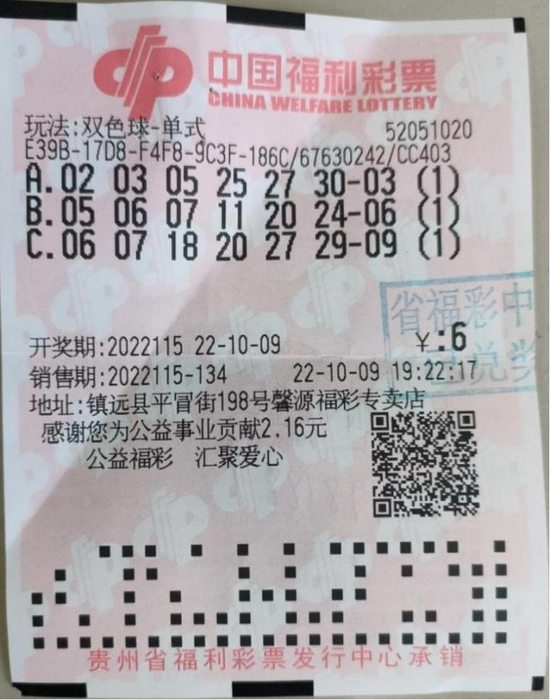 10月9日晚,双色球2022115期开奖,开出中奖号:06、07、18、20、27、29+09,当期一等奖全国开出33注,单注奖金530万元,李先生当期购买的6元单式票上其中1注号码与之完美“吻合”,中奖彩票售出于黔东南镇远县平冒街第52051020号投注站。