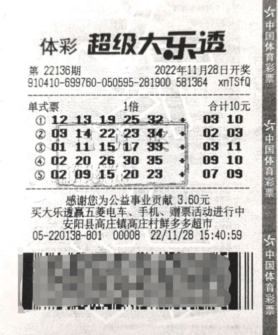 经核验,赵先生的中奖彩票是一张10元5注号码的单式票,其中第三注号码正中大乐透第22136期一等奖1注,奖金1000万元。