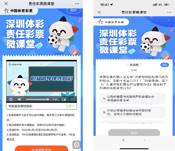在10月24日-11月23日期间,“责任彩票微课堂”每周推出一个MG动画视频,内容包括理性购彩、规范大额投注、不向未成年人销售及兑奖、禁止赊销及信用售彩等责任彩票主题,每个视频学习完毕,即可参与线上答题,以寓教于乐的方式让从业人员学习责任彩票相关内容。