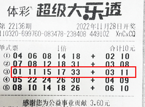 刘先生带来的中奖彩票是一张5注号码的单式票,投注金额为10元。该票第3注号码“01-11-15-17-33+03-11”与22136期大乐透开奖号码完全一致,中得当期1000万元头奖。刘先生介绍说,这5注号码是他自选的,已经守号两年多了,这期间他每期都坚持购买,从未落下。刘先生表示,他是体彩大乐透的忠实粉丝,以前没买过其他彩票游戏。不过最近世界杯特别火,身边的朋友很多人都玩竞彩,他也小试牛刀参与了世界杯竞猜,感觉挺有趣的。