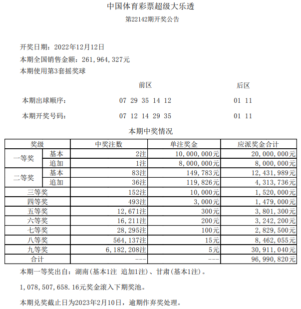 北京时间12月12日晚,体彩大乐透第22142期开奖,当期开奖号码为前区07 12 14 29 35,后区01 11。
