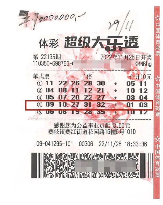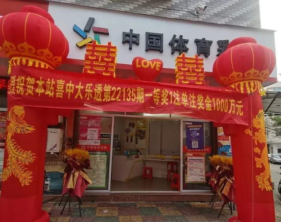 11月26日,第22135期体彩大乐透开奖,宁德福安赛岐镇赛江街道花园路16幢6号101D 41295实体店购彩者李先生凭借一张10元投入的5注单式票,中得一等奖1注,奖金1000万元。