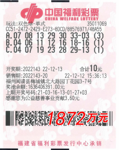 12月13日晚开奖的福彩双色球第2022143期,全国中出一等奖15注,单注奖金达624万元。福建揽获其中3注,大奖花落福州市闽清县梅城镇北大路园丁花园3-7号的福彩35011069投注站。中奖彩票是一张3注号码的单式票,其中第1注号码3倍投注,后面2注号码1倍投注,第1注击中一等奖,幸运狂揽3注双色球一等奖,喜获总奖金1872万元!