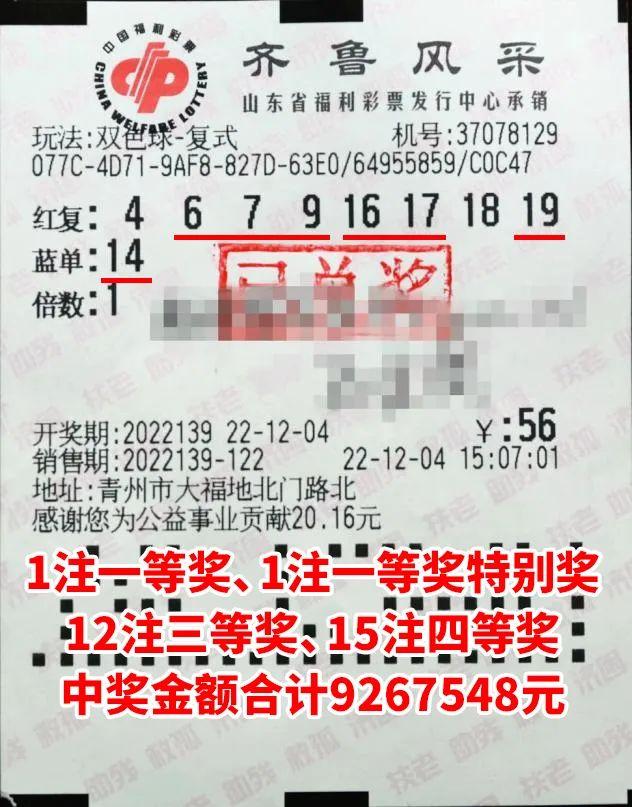 12月4日晚,福彩双色球第2022139期开奖,当期全国中出双色球一等奖12注,单注奖金700万余元。山东揽获2注一等奖,潍坊市37078129号福彩站分获其中1注。由于正值双色球12亿大派奖活动,奖金共计922万余元(含派奖奖金)。