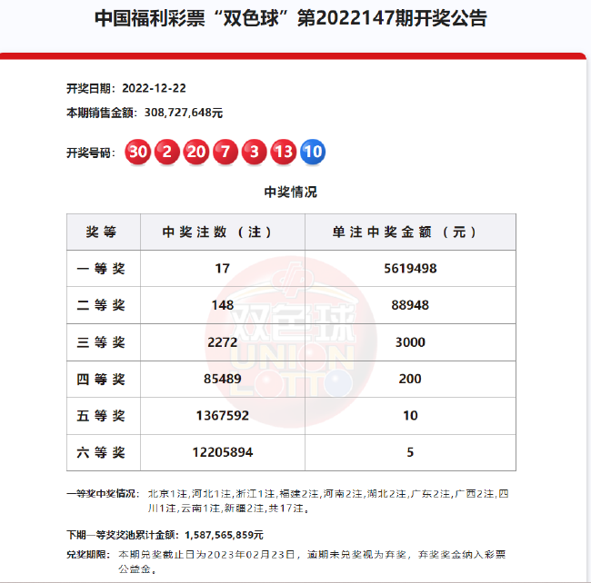北京时间2022年12月22日,福彩双色球迎来第22147期开奖,当期奖号为:红球02 03 07 13 20 30,蓝球10。