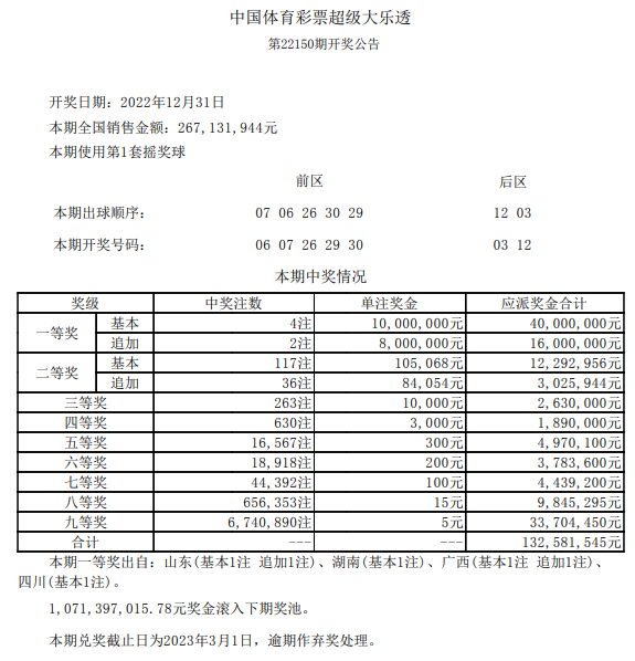 北京时间12月31日晚,体彩大乐透第22150期开奖。当期开奖号码为:前区06 07 26 29 30,后区03 12。