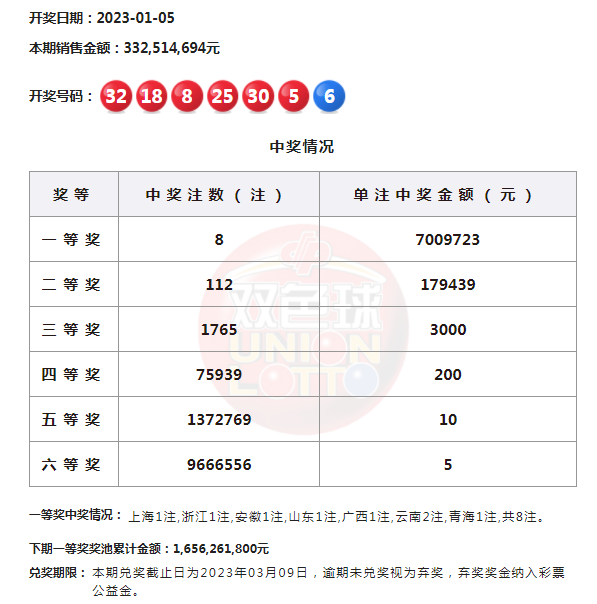 22:20 本期一等奖开出8注,单注奖金700万余元,其中云南中出2注,上海、浙江、安徽、山东、广西、青海各1注。二等奖开出112注,单注奖金17万余元。本期双色球销量为3.32亿元,计奖结束后奖池余额16.56亿元。