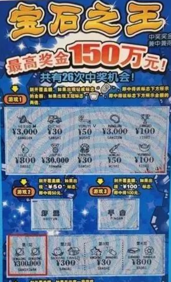 孟先生(化姓)陪爱人逛街,看见一家体彩店就想买几张试试自己的手气,一进门就看到放在柜面的“宝石之王”,代销者热情介绍说这个票最高可中150万元,中奖几率也很高。孟先生想着自己也没买过,就抱着试一试的心态买了一张,当他刮开游戏四的第一局时就看到两个相同符号,对照规则连忙刮开下面的奖金覆盖膜。
