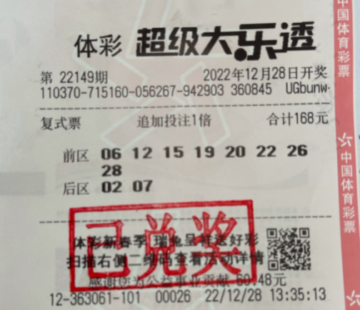 12月28日,体彩超级大乐透第22149期开奖,前区开出号码“15、19、22、26、28”,后区开出号码“02、07”。本期全国开出7注一等奖。其中1注追加投注一等奖1540万元花落山东潍坊坊子区。大奖得主王先生购买的中奖彩票是一张8+2复式追加票,票面投注金额168元,中得一等奖1注8559676元、四等奖15注共45000元、六等奖30注共6000元、八等奖10注共150元,由于采用了追加投注,王先生多拿了追加一等奖奖金6847740元,收获总奖金共计15458566元!